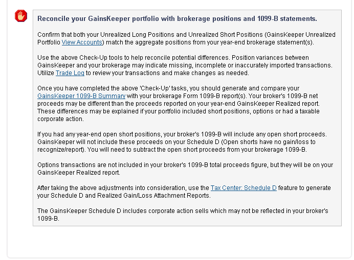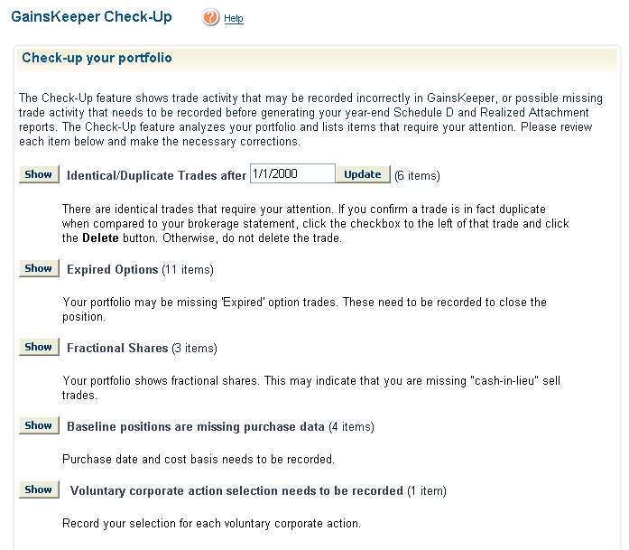 This feature enables you to view trade activity that may have been recorded incorrectly or trade activity that needs to be recorded before generating reports. The Check-Up feature analyzes your portfolio and list items that require your attention. Click here for more information on the alerts displayed on the Check-up page.