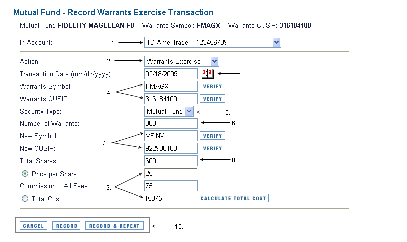 Click here to view an example of the Mutual Fund - Record Warrants Exercise Transaction page.