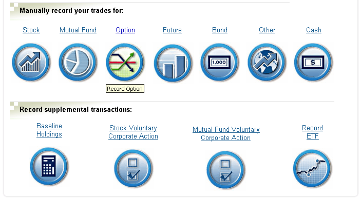 Click one of the icons above to view either a list of the transactions available for that category, or click the Baseline Holdings icon to access the Add New Baseline Holdings page.